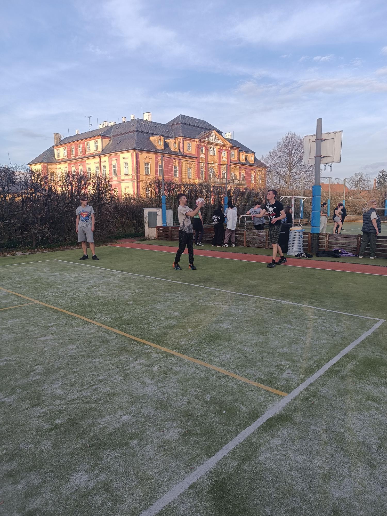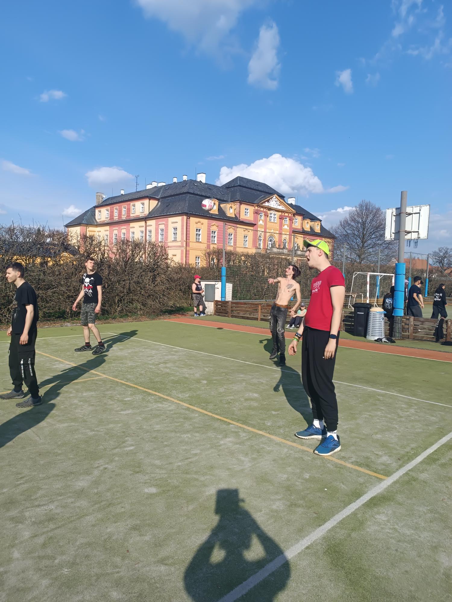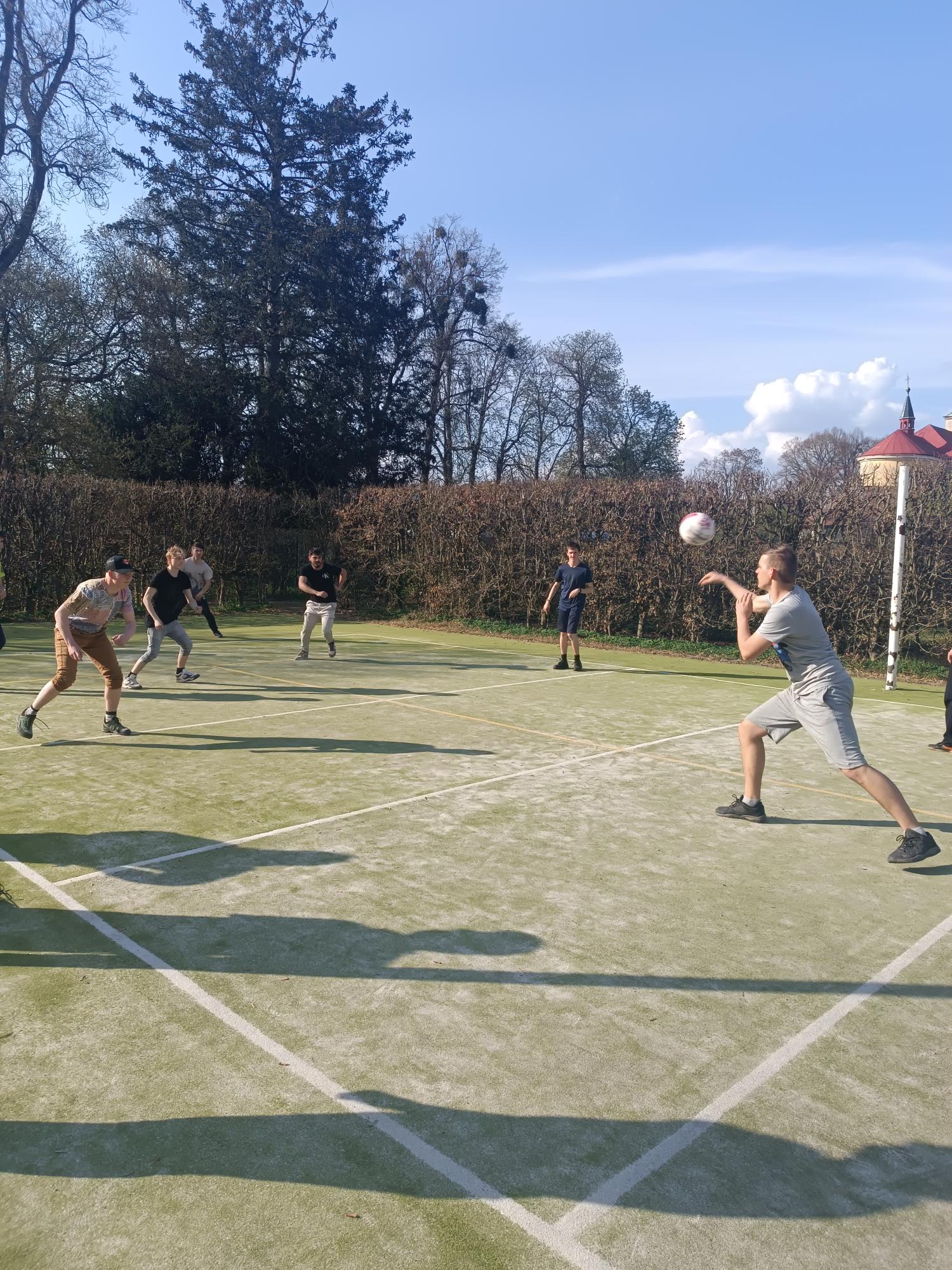 Ano, nacházíme se v sektoru sportovního vyžití již zmíněného zámeckého parku, kam se v pondělí 14.dubna, roku dvoutisícéhodvacátéhopátého vydalo změřit své síly 7 týmů z domova mládeže našeho učiliště v disciplíně vyžadující postřeh, rychlost, schopnost chytit balón, nahrát, spolupracovat a pružně reagovat na neustálé změny na soupeřově poli.